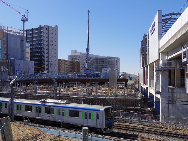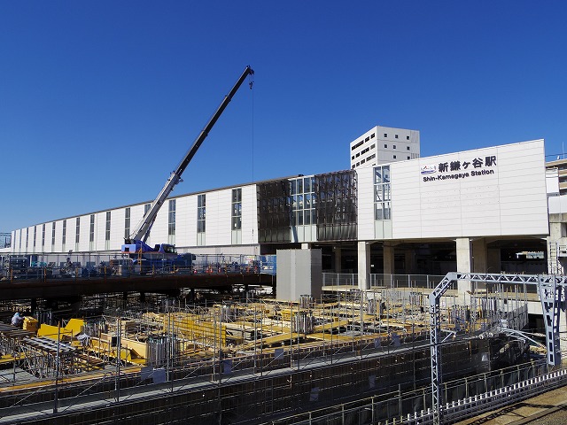 手前が初富方面、奥が新鎌ヶ谷駅である。旧新鎌ヶ谷駅の左側に、仮の新鎌ヶ谷駅が完成した。なお、この地点の踏切は一時閉鎖されていたが、イオン鎌ヶ谷ショッピングセンターオープンとともに再開された。
