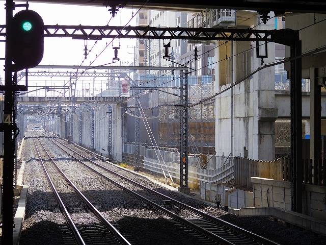 2003年3月9日 新鎌ヶ谷駅跨線橋より、北初富方向を眺める。仮の新鎌ヶ谷駅へのアプローチが地下通路によることがわかる。
